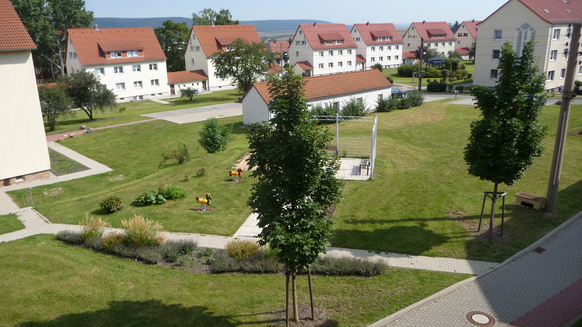 2010 - neu gestaltete Außenanlage mit Wäschetrockenplätzen, Spielplatzbereichen und PKW-Stellplätzen